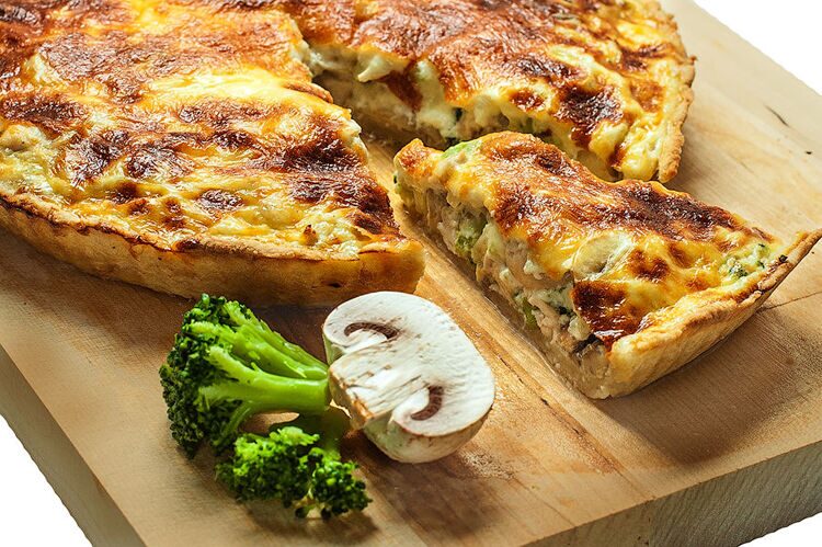 Состав: песочное тесто, брокколи, шампиньоны, куриное филе, яйцо, сливки, сыр.